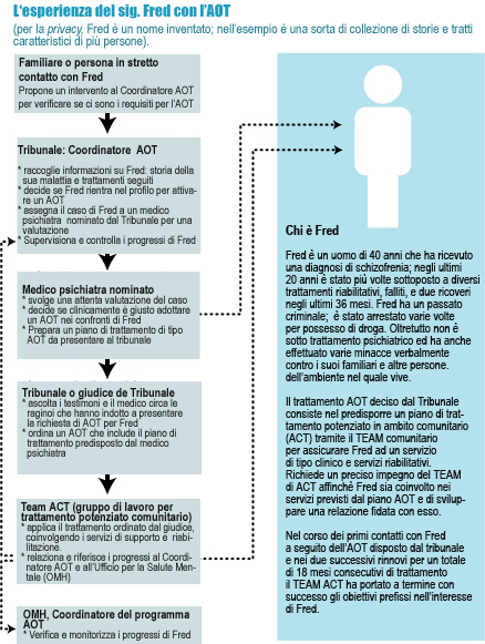 La legge permette a un tribunale di ordinare un trattamento sanitario obbligatorio (trattamento ambulatoriale assistito - AOT) per persone affette da malattie mentali gravi che hanno una storia di comportamenti violenti o ricoveri ripetuti.